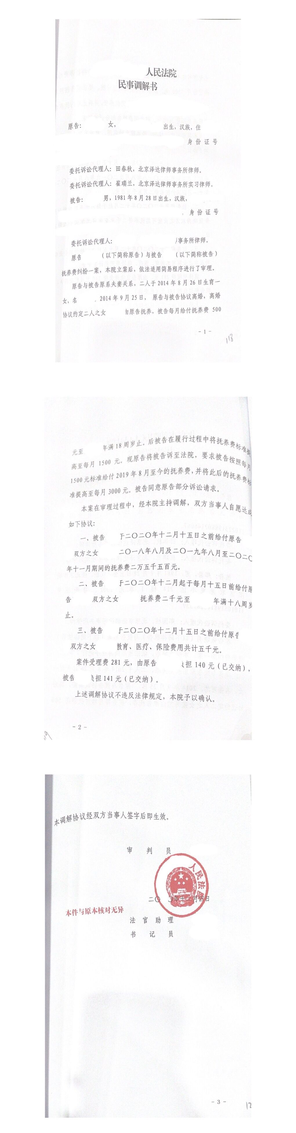 2014年9月,张某与郑某感情不和协议离婚,双方育有一女小爱,2014年8月出生。张某与郑某协议约定小爱由母亲张某单独抚养,父亲郑某每月支付500元抚养费。2017年,因当地物价提高,郑某口头约定增加每月抚养费到1500元,但自2019年起,郑某一直拖欠抚养费。女儿小爱生病期间,郑某也以多种理由不去探望。张某多次向郑某要求支付女儿抚养费,郑某均以各种理由推脱。后张某经人介绍,联系到我们北京泽达律师事务所。我所委派田春秋律师、崔瑞兰实习律师共同代理张某抚养费纠纷一案,起诉郑某支付抚养费,增加抚养费,后经多方协商,最终调解胜诉。