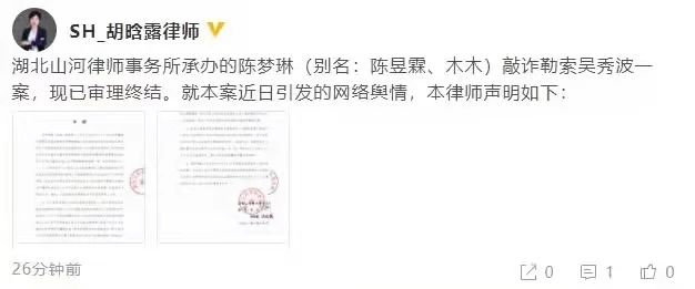判决书曝光后,19日,陈昱霖方委托律师也发布声明。