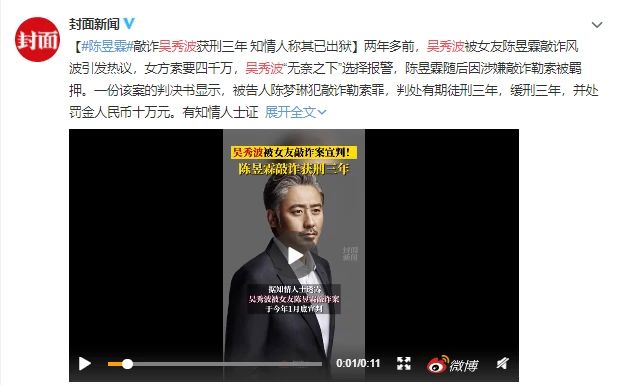 2月18日,据媒体报道,有知情人士透露,吴秀波被女友陈昱霖敲诈案于今年1月底宣判,被告人陈昱霖(真名 陈梦琳)犯敲诈勒索罪,判处有期徒刑三年,缓刑三年,并处罚金人民币十万元。判决书还提到,案发后,吴秀波与陈昱霖签订了谅解协议,吴秀波方在法庭也出具了谅解书。