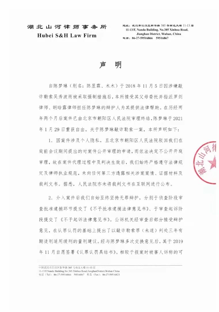 声明称该案件一审宣判后陈梦琳决定不提起上诉,判决已于2月9日生效。并表示在案件代理过程中及判决生效后,己方未向任何第三方透露相关涉案案情、证据材料及裁判文书。同时对于吴秀波于2018年向女方转账的300万元,“因公诉机关以犯罪未遂提起公诉,陈梦琳及其父母无义务向被害人退赔”。声明中还提到“案件就陈梦琳一方而言不存在所谓幕后利益集团或犯罪集团的操纵”。